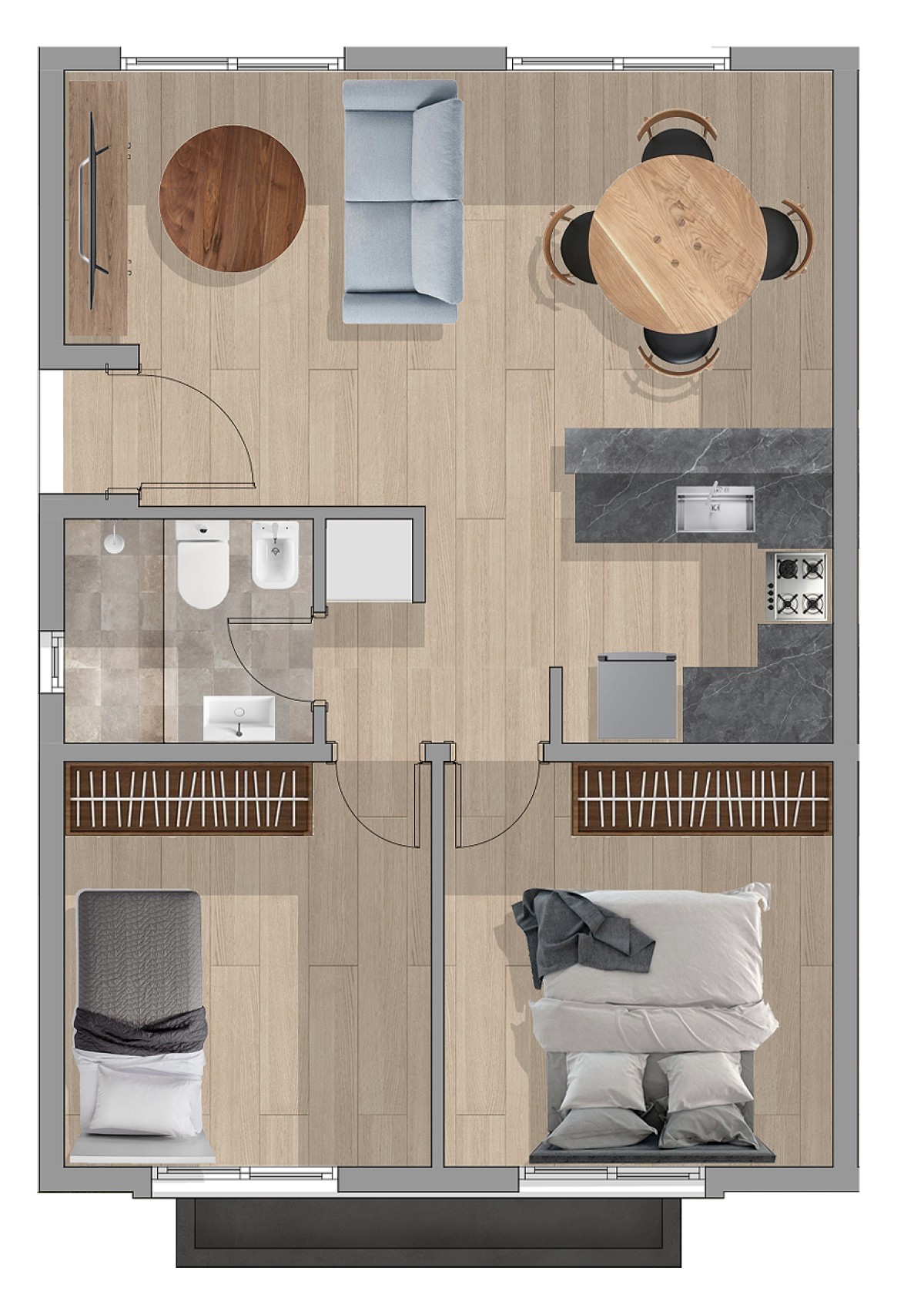 2 Dormitorios, baño completo, cómodo living-comedor con cocina integrada.